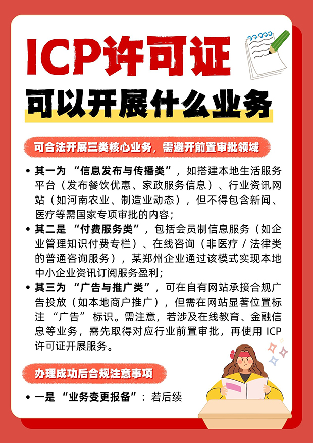 在河南持有 ICP 许可证,可合法开展三类核心业务,需避开前置审批领域。