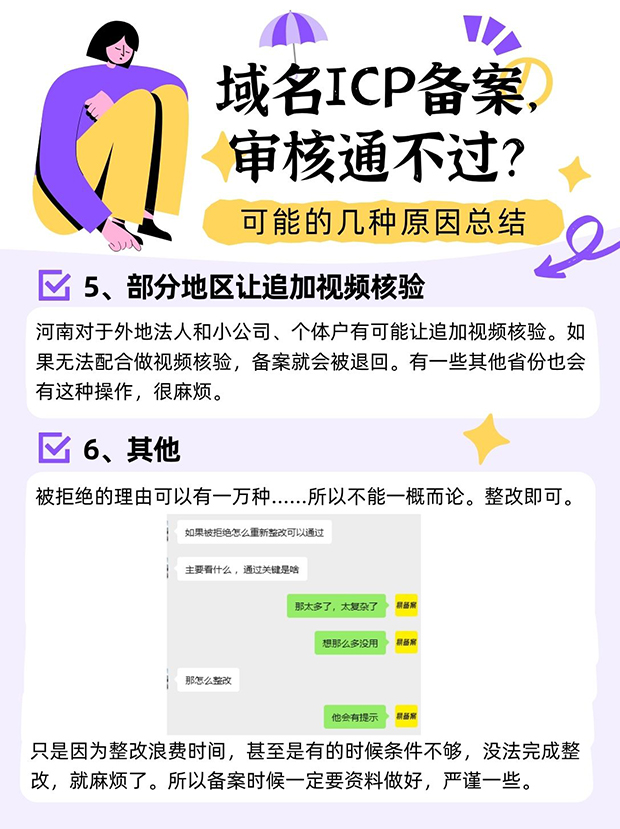 河南对于外地法人和小公司、个体户有可能让追加视频核验。如果无法配合做视频核验,备案就会被退回。有一些其他省份也会有这种操作,很麻烦。