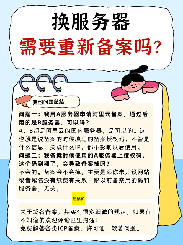 如果你做的是阿里云备案,通过之后,换阿里云国内的任何一个服务器,都无需再次备案。