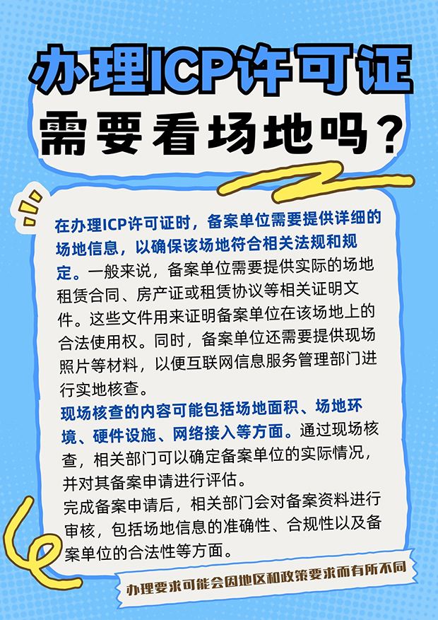 在办理ICP许可证时,备案单位需要提供详细的场地信息,以确保该场地符合相关法规和规定。一般来说,备案单位需要提供实际的场地租赁合同、房产证或租赁协议等相关证明文件。这些文件用来证明备案单位在该场地上的合法使用权。同时,备案单位还需要提供现场照片等材料,以便互联网信息服务管理部门进行实地核查。