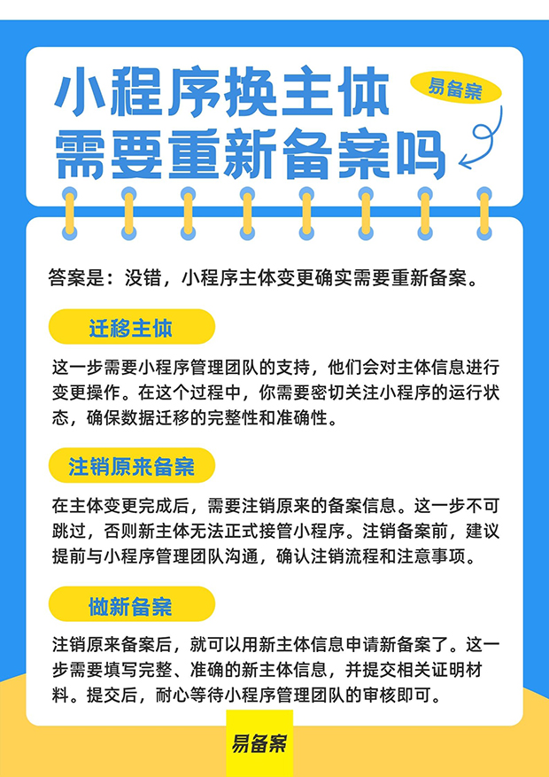 第三步,做新备案。注销原来备案后,就可以用新主体信息申请新备案了。这一步需要填写完整、准确的新主体信息,并提交相关证明材料。提交后,耐心等待小程序管理团队的审核即可。