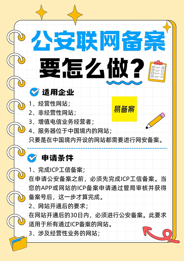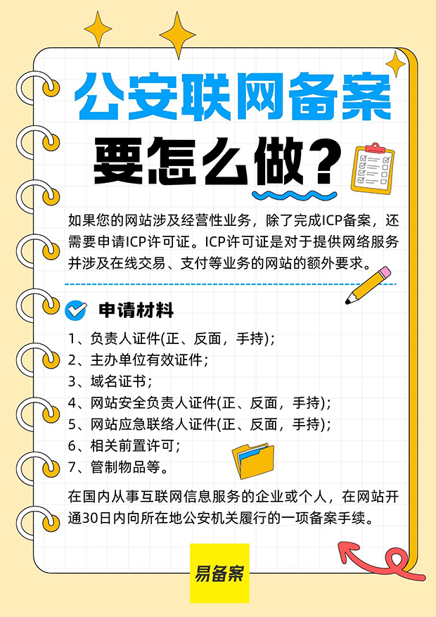 公安备案,又称网安备案或公安联网备案,是根据法律法规要求,在国内从事互联网信息服务的企业或个人,在网站开通30日内向所在地公安机关履行的一项备案手续。