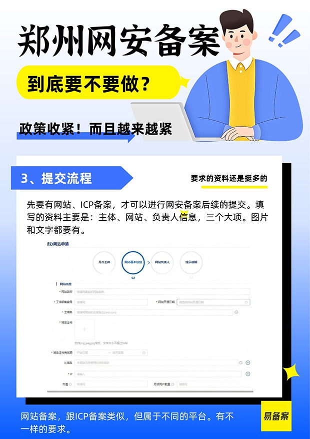 先要有网站、ICP备案,才可以进行网安备案后续的提交。填写的资料主要是:主体、网站、负责人信息,三个大项。图片和文字都要有。