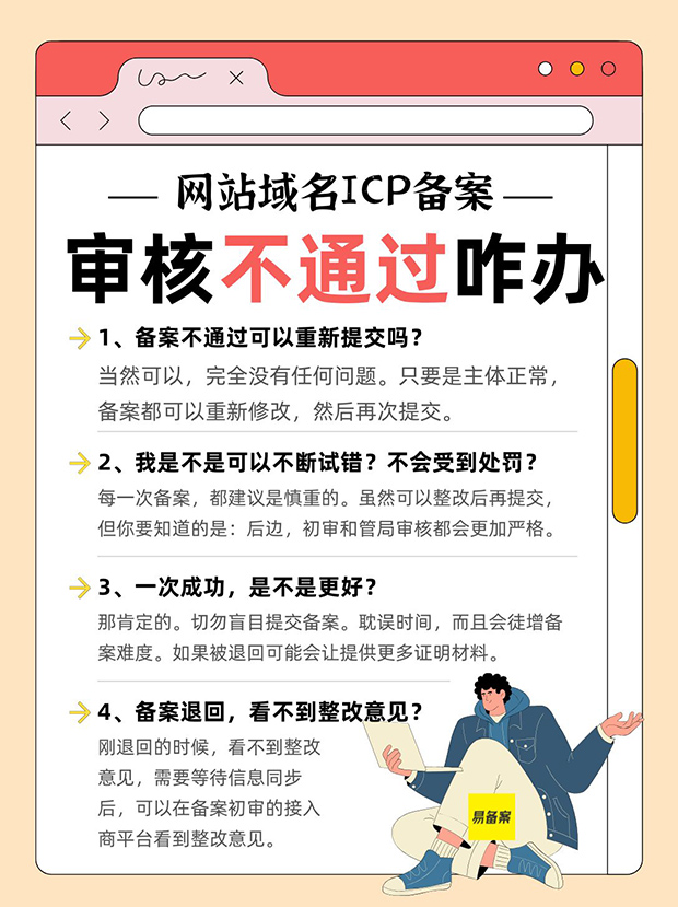 当然可以,完全没有任何问题。只要是主体正常,备案都可以重新修改,然后再次提交。2、我是不是可以不断试错?不会受到处罚?