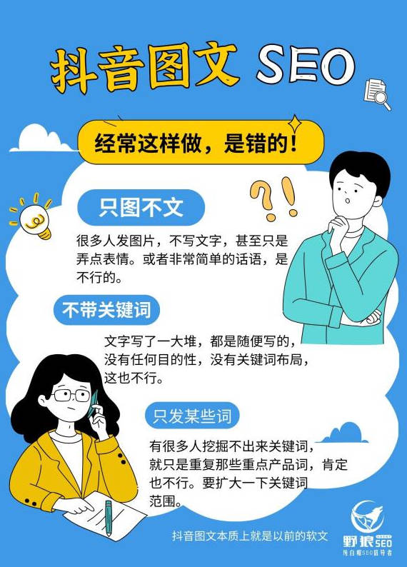 实际上跟以前的发帖原理基本一样,就是增加了一个自然推流而已。看到大家很多人做的抖音图文,其实挺有感触的,尤其是有一些一看就是错的,还是想指出来。图文SEO,经常这样做,是错的!