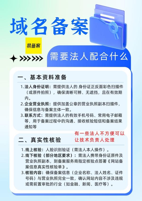 3.联系方式:需提供法人的有效手机号码、常用电子邮箱等,用于备案过程中的沟通、接收核验短信和备案结果通知等