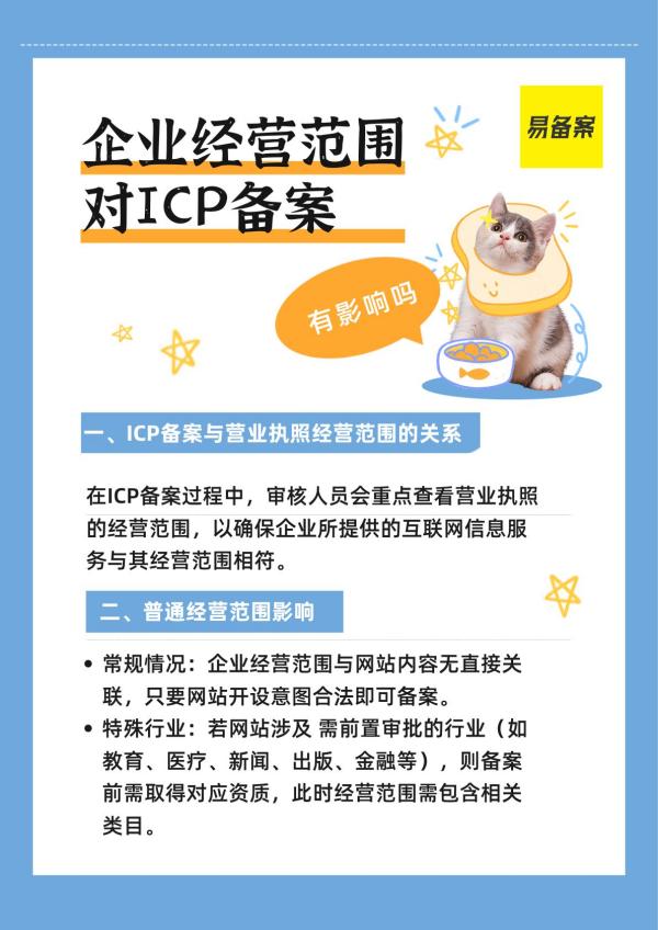 特殊行业:若网站涉及需前置审批的行业(如教育、医疗、新闻、出版、金融等) ,则备案前需取得对应资质,此时经营范围需包含相关类目。