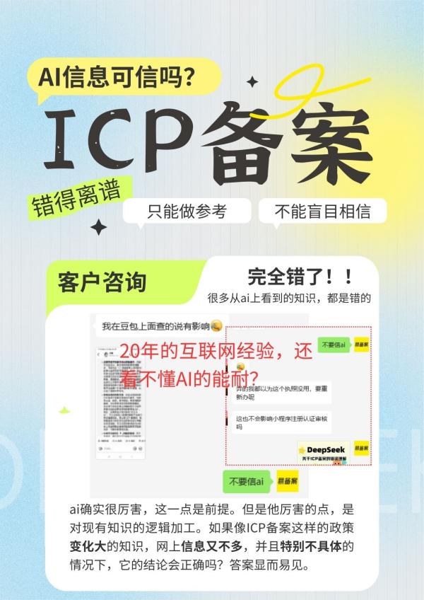 很多从ai上看到的知识,都是错的我们其实也用ai,也验证过备案方面的知识,得出的结论是:错误比较多。