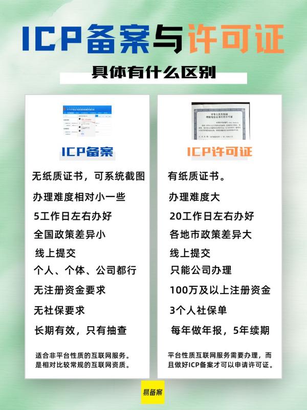 3、有在线交易,部分情况需要ICP备案,部分情况需要ICP许可证。区别在于:含不含增值电信服务的在