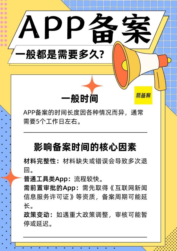 APP备案的时间长度因各种情况而异,通常需要5个工作日左右。