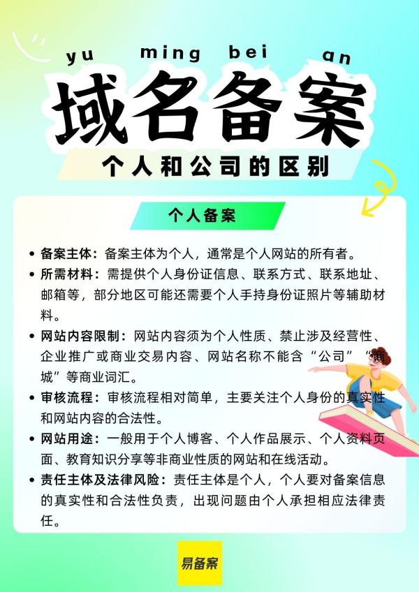责任主体及法律风险:责任主体是个人,个人要对备案信息的真实性和合法性负责,出现问题由个人承担相应法律责任。