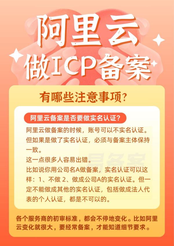 比如说你用公司名A做备案,实名认证可以这样: 1、不做2、做成公司A的实名认证。但一定不能做成其他的实名认证,包括做成法人代表的个人认证,都是不可以的。