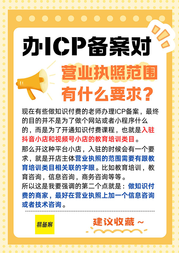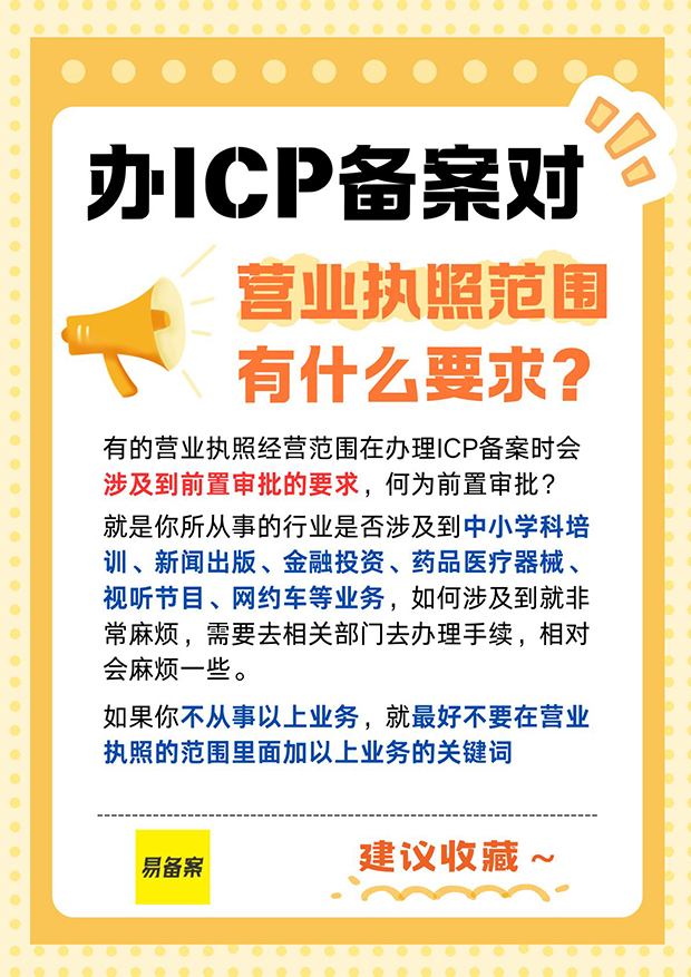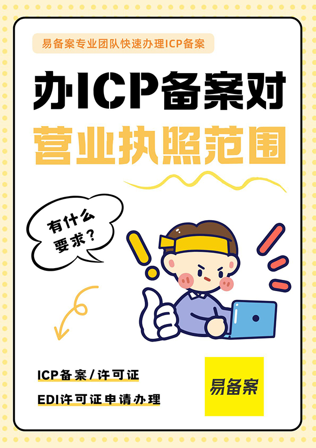 最近很多人咨询易备案,办理ICP备案对营业执照的范围有什么要求吗?小编在这里明确告知大家,是有要求的,具体什么要求,我们往下看。