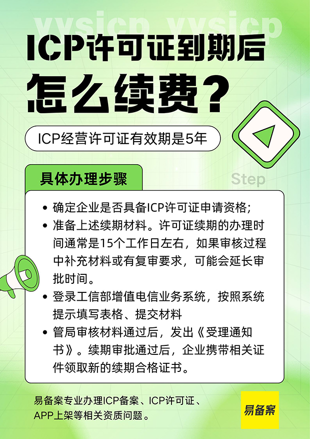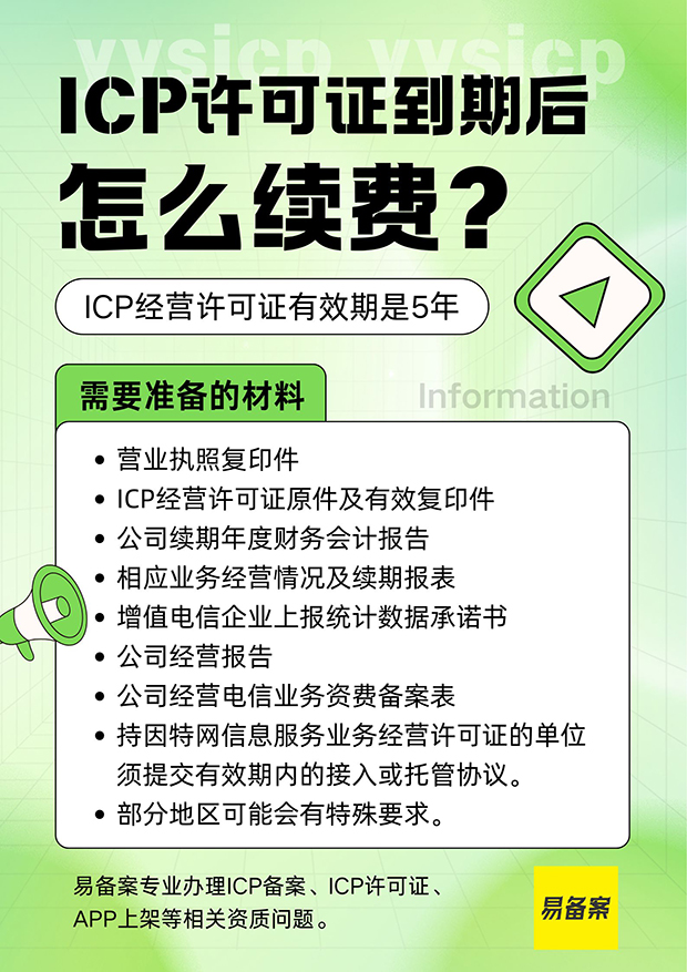ICP经营许可证是有时间限制的,一般有效期是5年。拿到证书后从第二年开始每年第一季度会进行年检,并且需要在有效期届满90日前办理续期,否则按规定就不能再开展相关线上业务。很多人都不了解ICP许可证具体怎么办理续期,今天就把相关资料整理给大家。