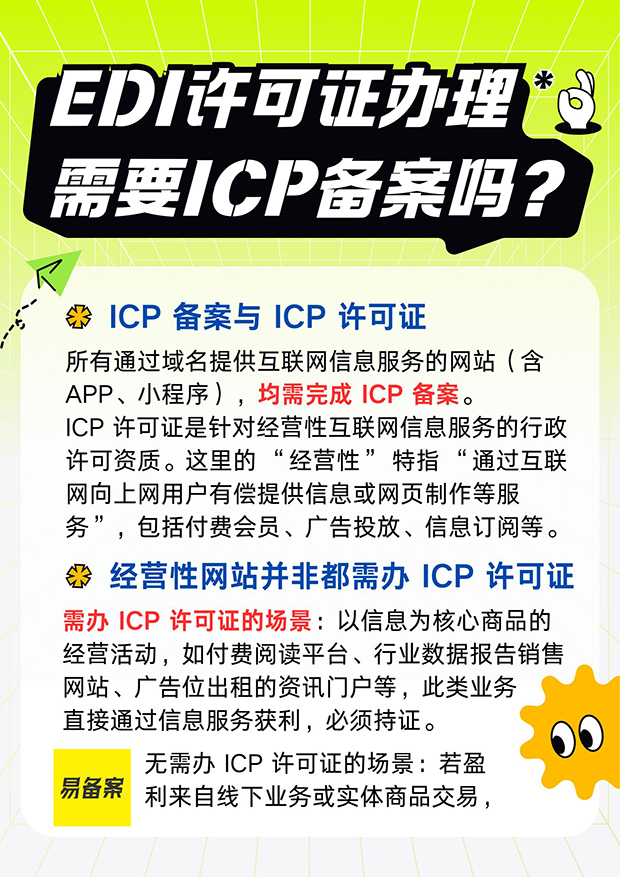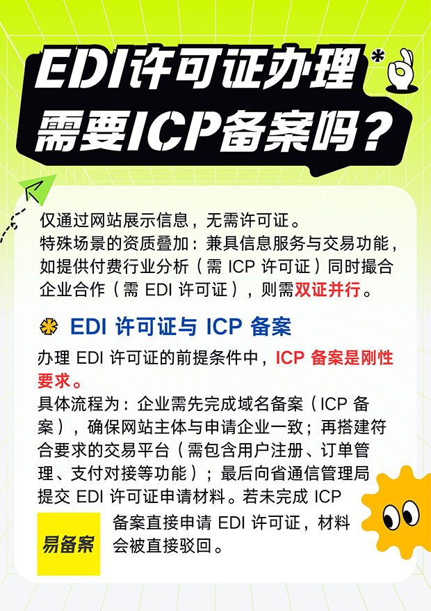 办理 EDI 许可证的前提条件中,ICP 备案是刚性要求。