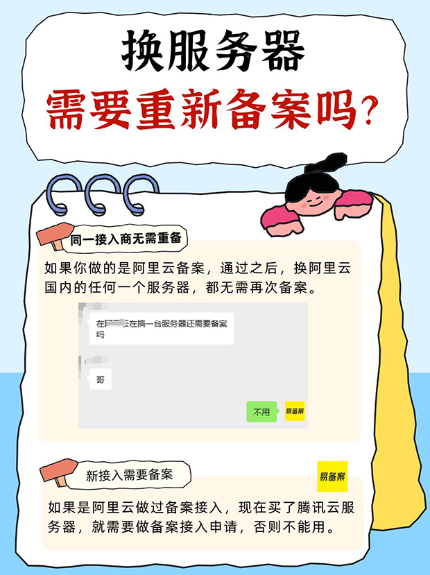 如果你做的是阿里云备案,通过之后,换阿里云国内的任何一个服务器,都无需再次备案。