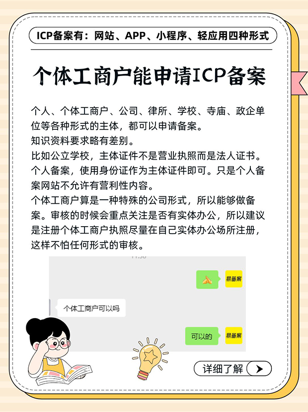 个体工商户算是一种特殊的公司形式,所以能够做备案。审核的时候会重点关注是否有实体办公,所以建议是注册个体工商户执照尽量在自己实体办公场所注册,这样不怕任何形式的审核。