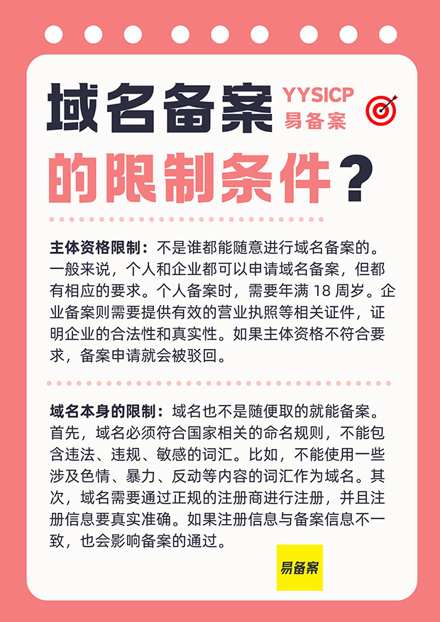 不是谁都能随意进行域名备案的。一般来说,个人和企业都可以申请域名备案,但都有相应的要求。个人备案时,需要年满 18 周岁。企业备案则需要提供有效的营业执照等相关证件,证明企业的合法性和真实性。如果主体资格不符合要求,备案申请就会被驳回。二、域名本身的限制