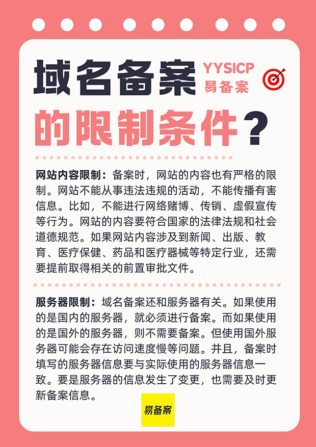 总之,域名备案的这些限制都是为了维护互联网的健康、有序发展。虽然这些限制看起来有些繁琐,但都是必要的。大家在进行域名备案时,一定要仔细了解相关的规定,确保所有信息真实准确,这样才能顺利通过备案。