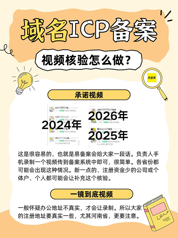 这是很容易的,也就是易备案会给大家一段话。负责人手机录制一个视频传到备案系统中即可,很简单。各省份都可能会出现这种情况。新一点的、注册资金少的公司或个体户、个人都可能会让补充这个核验。