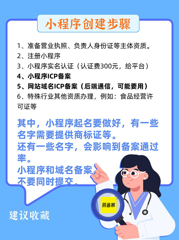 其中,小程序起名要做好,有一些名字需要提供商标证等。还有一些名字,会影响到备案通过率。
