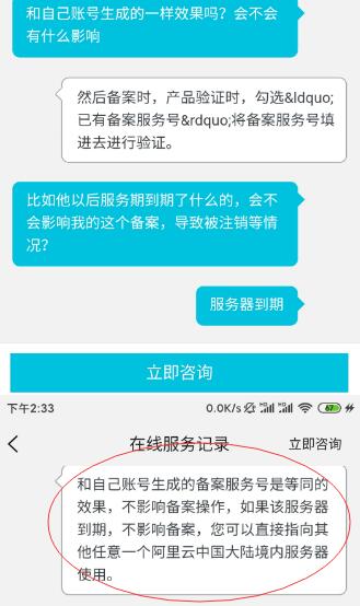 答:备案成功后只要继续使用大陆地区任意阿里云服务器虚拟主机等产品就不会注销备案,以下为作者与客服关于备案的询问截图。